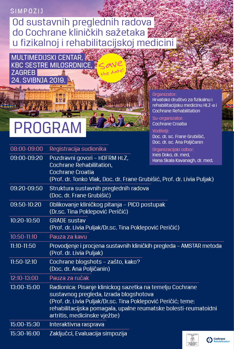 zadovoljstvo nam je pozvati Vas na simpozij „Od sustavnih preglednih radova do Cochrane kliničkih sažetaka u fizikalnoj i rehabilitacijskoj medicini“ koji će se održati 24. svibnja 2019. god. u Zagrebu.